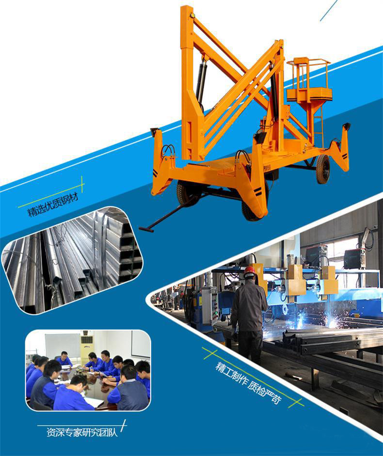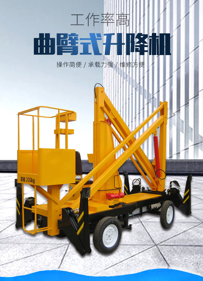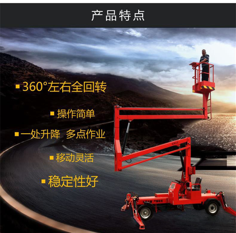 拖車曲臂式升降機:可以掛在汽車上,與汽車同步,適合野外高空作業(yè)。升降方式:1、用380-220V電源2、用電源不方便,可以用電瓶驅(qū)動升降。外型美觀,行走方便。